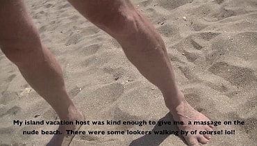 Im a guest of a fan that invited me and my camera man Champ to a nude beach in the Caribbean. After hanging out for a little I noticed how hot he was getting hanging out with me. I was getting a bit horny too, being that all those guys are watching and creeping around to look at me in the nude! Of course as an Exhibitionist Wife I tend to like to tease in public, but this time it was my host who was teasing me! He reached around me after massaging me and all of a sudden he was finger fucking me right there on the beach in full view of anyone who was watching! Then, he rubbed my clit in such a way that I was shuddering with orgasms! Of course I had to reach around and tug that Big Black Cock while I was at it! Now Im having a fun nude beach vacation!